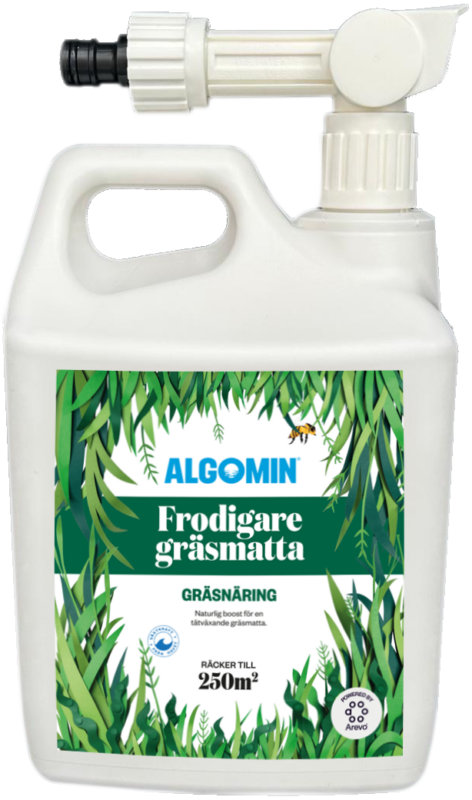 HUR FUNGERAR PRODUKTEN? Algomins gräsnäring Frodigare gräsmatta är en ny typ av näring till gräsmattan. Den ger gräset den boost det behöver för att växa friskt genom att stimulera mikrolivet på ett naturligt sätt, tack vare ingrediensen argininfosfat som produceras med majs som råvara. Argininfosfat ger liv till jorden, vilket gynnar mikroorganismer som mykorrhiza och andra mikrober. Tillsatsen av brunalgsextrakt ger extra styrka till rotsystemet och minskar stress vid torka. Produkten har dessutom minimal påverkan på miljön tack vare att Argininfosfat inte sköljs bort vid regn eller vattning. Näringen ligger kvar i jorden och är långtidsverkande. Du får en frodig och håll-bar gräsmatta som du kan njuta av hela säsongen NÄR SKA JAG GÖDSLA? Gödsla 1 gång när gräset har börjat växa på våren. Ge gärna en giva Grönare gräsmatta eller annat gräsgödsel efter ca 6-8 veckor för att tillföra ytterligare näring.